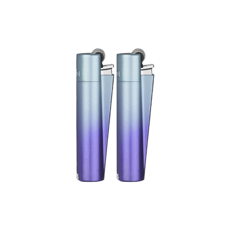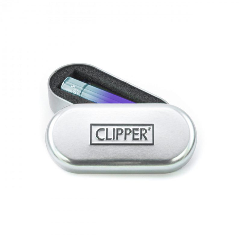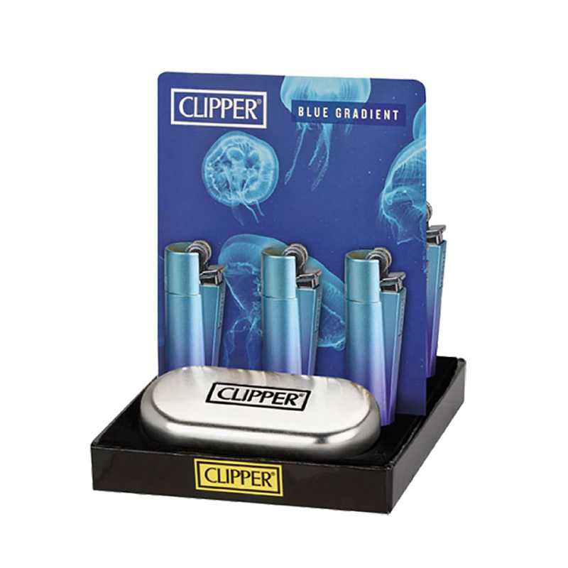 Display box of 12 metal clipper lighters with separate silver box for each lighter.